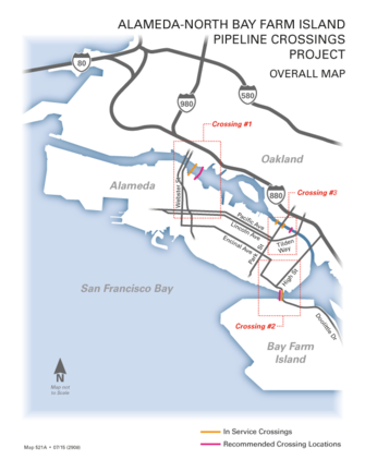 EBMUD is planning to construct three transmission pipelines (24-inch inner diameter) located within Alameda County in the Cities of Oakland and Alameda. Water service to the City of Alameda is provided by four existing underwater pipeline crossings at three separate locations between the City of Oakland, Alameda Island, and North Bay Farm Island. Failure of one of three existing crossing locations could lead to a reduction in the level of service for existing customers and potentially reduce the available water supply to Alameda Island and North Bay Farm Island. Three new pipeline crossings are proposed to replace the existing pipeline crossings to ensure long-term reliability of the water distribution system, meet existing and future water needs, and facilitate repair and replacement of aging infrastructure.