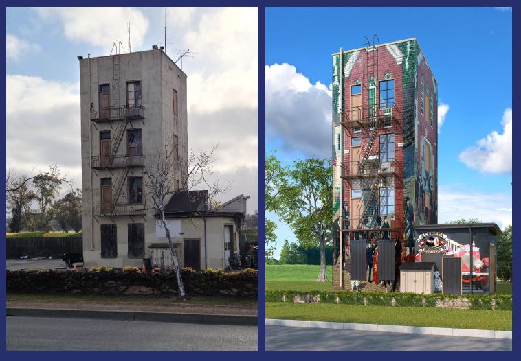 Greenway’s current lease does not include the entry at Island Drive and Clubhouse Memorial Road. Greenway is asking the Alameda City Council to extend the lease to include this area so we can reface the exterior of the tower and work with local artists and students to create an art installation that honors local first responders and celebrates the structure’s prior use as a firefighter training facility.